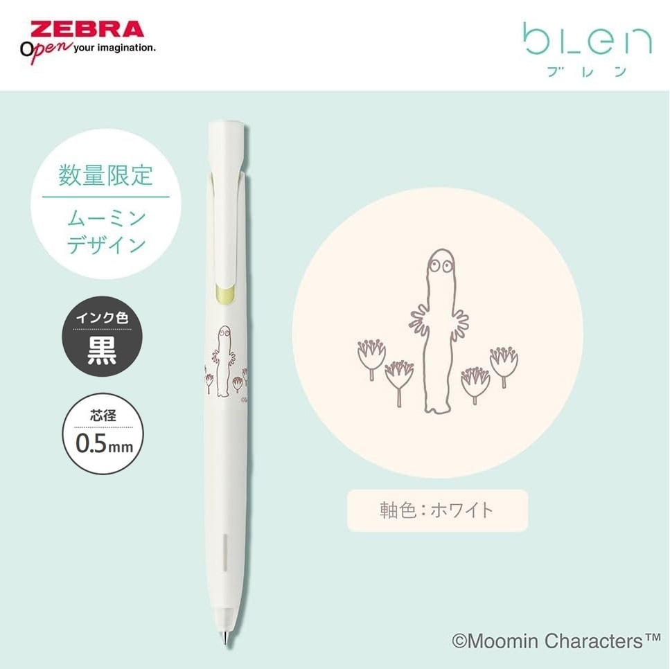 樹精 Moomin 姆明 日本製 Zebra bLen 0.5mm 黑色 原子筆 (BAS88-MM-W) ▪️ 低噪音:消除組件間的縫隙,防止筆尖晃動,降低聲響。 ▪️ 低重心:筆端配置金屬組件降低重心,防止書寫震動。 ▪️ 低震動:消筆芯位於筆尖,除筆嘴吼與筆尖的間隙,防止晃動。 墨水顏色:0.5mm 黑色 鉛芯:0.5mm 尺寸: 143mm (長) x 10.8mm (直徑) 重量:約 13g 日本進口,日本製造 Made in Japan