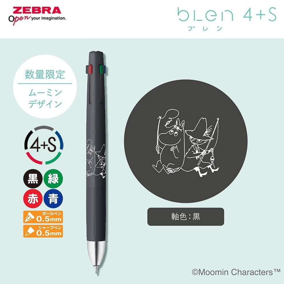 現貨|Moomin 姆明 Snufkin 史力奇 日本製 Zebra bLen 4+S 低震 多功能 5用筆 (4色原子筆 + 鉛芯筆) B4SAS88-MM-BK